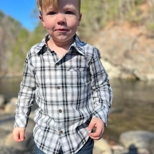 With a contrast solid hood, our Button Down Flannel Shirt with Hood Plaid Black and Caramel is super easy to layer over any of his favorite tees! T...