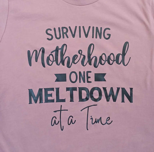 Embrace the beautiful chaos of motherhood with this tee shirt that gets it. Featuring the honest mantra "Surviving Motherhood One Meltdown at a Tim...