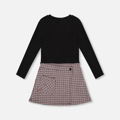 The Bi-Material Dress Black and Houndstooth is a chic statement piece with a clever layered look. This long sleeve dress pairs a brushed rib black ...