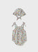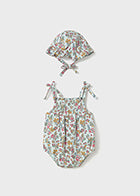 Original two-piece set for newborn. Sleeveless romper for newborn. Button closure at the crotch. Printed design. Sweet bucket hat for newborn.