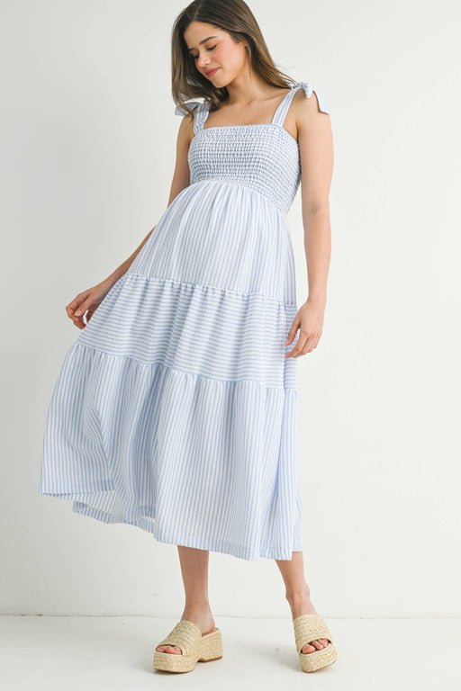 View full detailsChambray Striped Ruffle Tiered Maternity Midi Dress