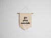 "Go Play Outside" Add texture and personality to your walls while reminding your little ones to get some fresh air! This modern banner is a lovely mix of neutral, natural materials - including canvas, oak wood, and cotton twine - with all materials sourced in the United States, sewn locally, and printed in-house by hand. Each individual banner measures 14" wide by 20" tall from the top of the canvas to the bottom point.