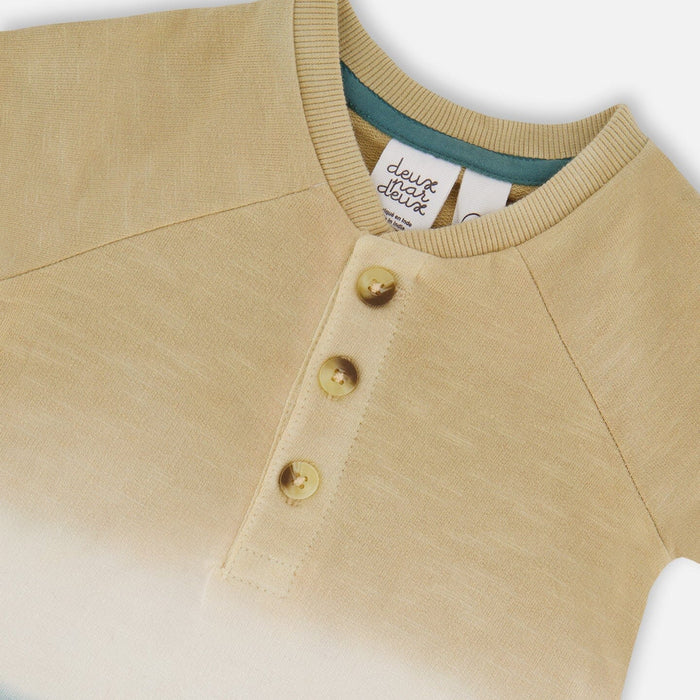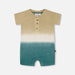 Little ones can crawl and play and lounge in style in our One-Piece Romper Gradient Beige and Teal. Perfect for any warm weather day, this adorable one-piece is super soft in a cotton/poly blend with short raglan sleeves, a henley neckline with a three button placket, and snap legs for easy diaper changes.