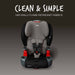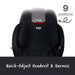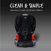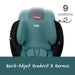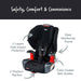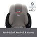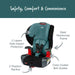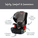 - Energy-absorbing shell and foam-lined headrest protect your child’s head, neck, and torso.