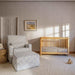 The Sarah Flint x Namesake Crawford Glider offers an elevated take on traditional style and brings nursery comfort to a new level with its plush pillowback design, added lumbar pillow, and wide seat. Its smooth, back-and-forth gliding motion helps you rock your baby to sleep with ease, while the convenient swivel creates an inviting repose for both you and your baby.