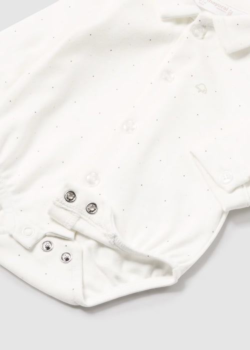 Perfect for any wardrobe, this stylish collared bodysuit features tiny dots that pair perfectly with any pants option.