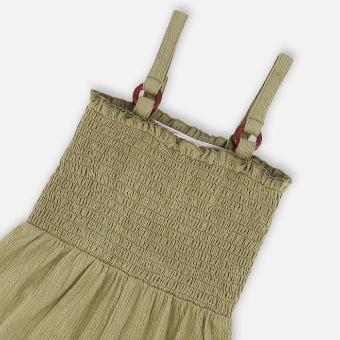 Wooden O-rings add distinctive style to our Smocked Crinkle Jersey Jumpsuit Olive Green. Soft and lightweight in an easy one-piece silhouette, this jumpsuit features wide straps with wooden rings, a smocked bodice with a square neckline, and cropped wide legs that make it comfy and chic!